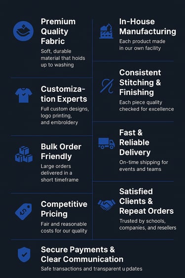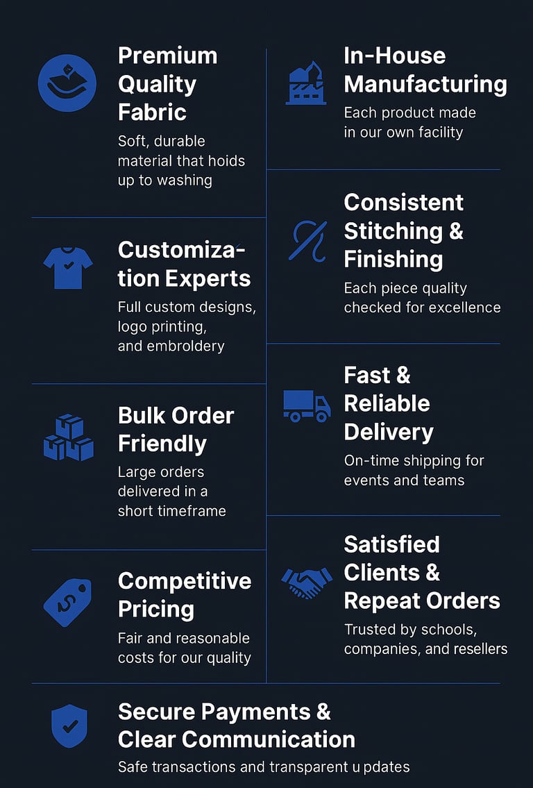 We manufacture high-quality sports uniforms and casual wear trusted by teams, academies, and brands worldwide. Every product is made in our own facility with strict quality control to ensure consistent results. From fabric selection to final stitching, each step is handled with precision and expertise. We prioritize fast turnaround times and deliver even bulk orders on schedule without compromising quality. Our repeat clients stand as proof of our reliability, professionalism, and long lasting product standards giving you full confidence when placing your order with us.